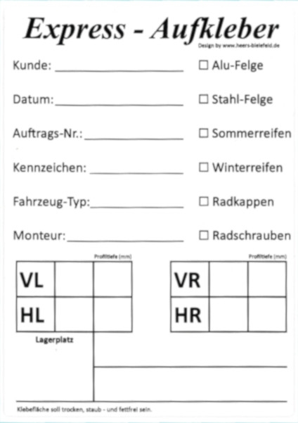 Die weißen Aufkleber mit maximaler Klebkraft sind vorbeschriftet und helfen Ihnen dabei, die wichtigsten Informationen rund um Reifen und Felgen direkt zusammenzutragen. Von Informationen über den Kunden oder das Datum der Einlagerung bis zur Zuordnung von Achse und Seite können Sie die Express Aufkleber mit wenigen Handgriffen umfassend beschriften, um Ordnung in Geschäft und Lager zu halten. Jede Rolle umfasst mehrere Hundert Aufkleber und sichert Ihnen auch bei täglichem Einsatz eine lange Lebensdauer der praktischen Reifenaufkleber zu. Unser Team berät Sie gerne bei der Auswahl dieser und weiterer Artikel zur Beschriftung, um in jedem beruflichen Umfeld von preisbewussten Lösungen zu profitieren!