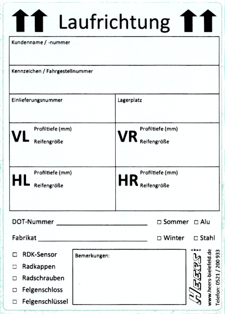 Die weißen Aufkleber mit maximaler Klebkraft sind vorbeschriftet und helfen Ihnen dabei, die wichtigsten Informationen rund um Reifen und Felgen direkt zusammenzutragen. Von Informationen über den Kunden oder das Datum der Einlagerung bis zur Zuordnung von Achse und Seite können Sie die Express Aufkleber mit wenigen Handgriffen umfassend beschriften, um Ordnung in Geschäft und Lager zu halten. Jede Rolle umfasst mehrere Hundert Aufkleber und sichert Ihnen auch bei täglichem Einsatz eine lange Lebensdauer der praktischen Reifenaufkleber zu. Unser Team berät Sie gerne bei der Auswahl dieser und weiterer Artikel zur Beschriftung, um in jedem beruflichen Umfeld von preisbewussten Lösungen zu profitieren!